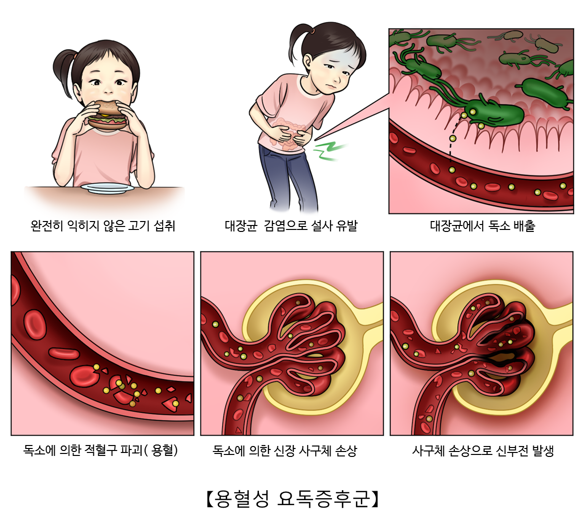 용혈성 요독 증후군은 신장의 미세혈관 안에 혈전이 생기면서 혈관을 막고 적혈구를 파괴하는 용혈을 일으켜 신장에 손상을 주는 질환으로 전신에서 작은 피떡(혈전)이 갑작스럽게 많이 형성됩니다. 원인에 따라 대장균 등이 만드는 독소 때문에 발생하는 전형적 용혈성 요독 증후군과 대장균과 관계없이 생기는 비전형적 용혈성 요독 증후군으로 나눕니다. 전형적 용혈성 요독 증후군의 경우 균이 감염된 음식을 먹고 난 뒤 생기며, 성인도 걸릴 수 있는 질환이지만 소아에서 주로 발생합니다.