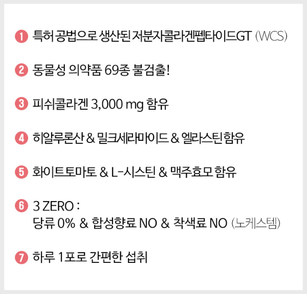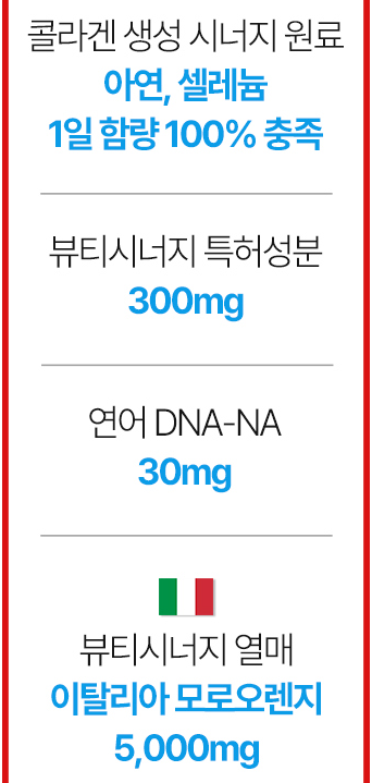 히알루론산, 엘라스틴 등의 성분이 부원료로 함유돼 있는지도 살펴봐야 합니다. 히알루론산과 엘라스틴은 콜라겐과 함께 진피층을 이루는 성분이다. 콜라겐과 수분이 빠져나가지 않도록 묶고 연결해주는 역할을 합니다. 그렇기 때문에 콜라겐과 함께 히알루론산, 엘라스틴을 보충해야 콜라겐이 분해되는 것을 막아 더욱 피부 건강에 도움이 될 수 있습니다.