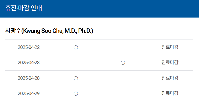 ✅ 현재 차광수 교수님은 4월 말까지 진료 예약이 차있는 상태입니다.